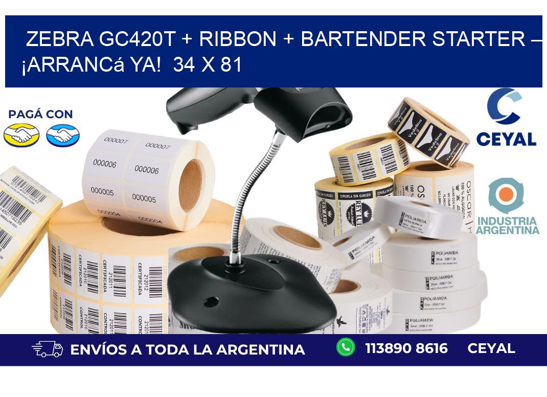 Zebra GC420T + Ribbon + BarTender Starter – ¡Arrancá ya! 34 x 81